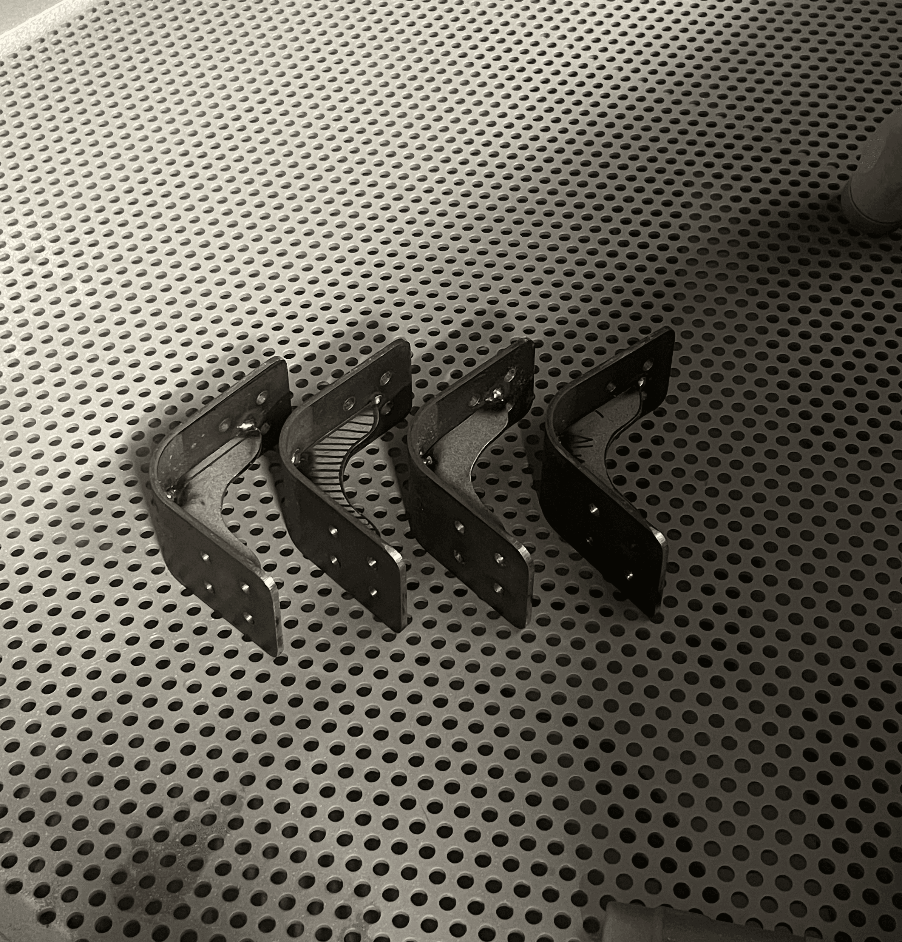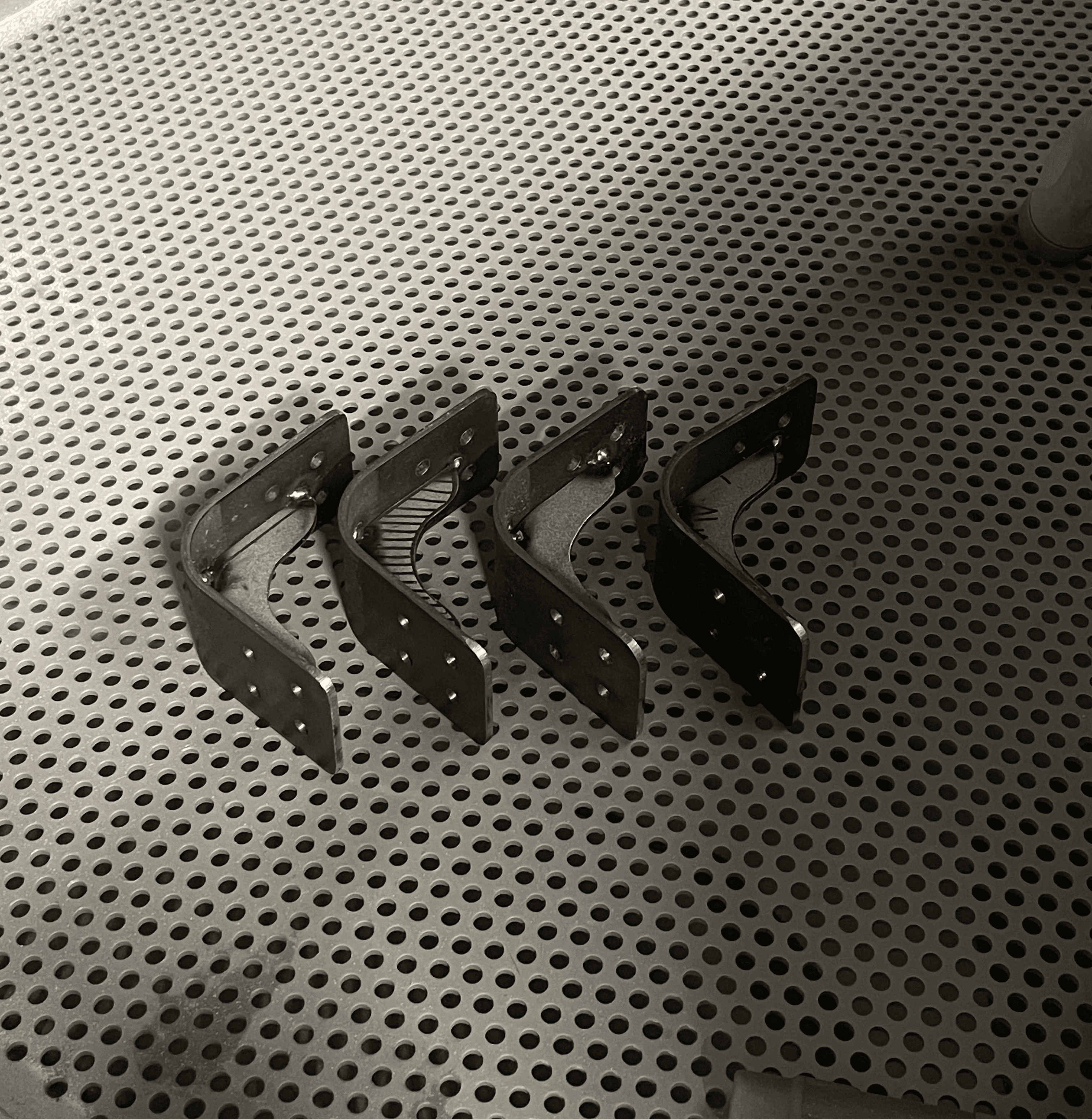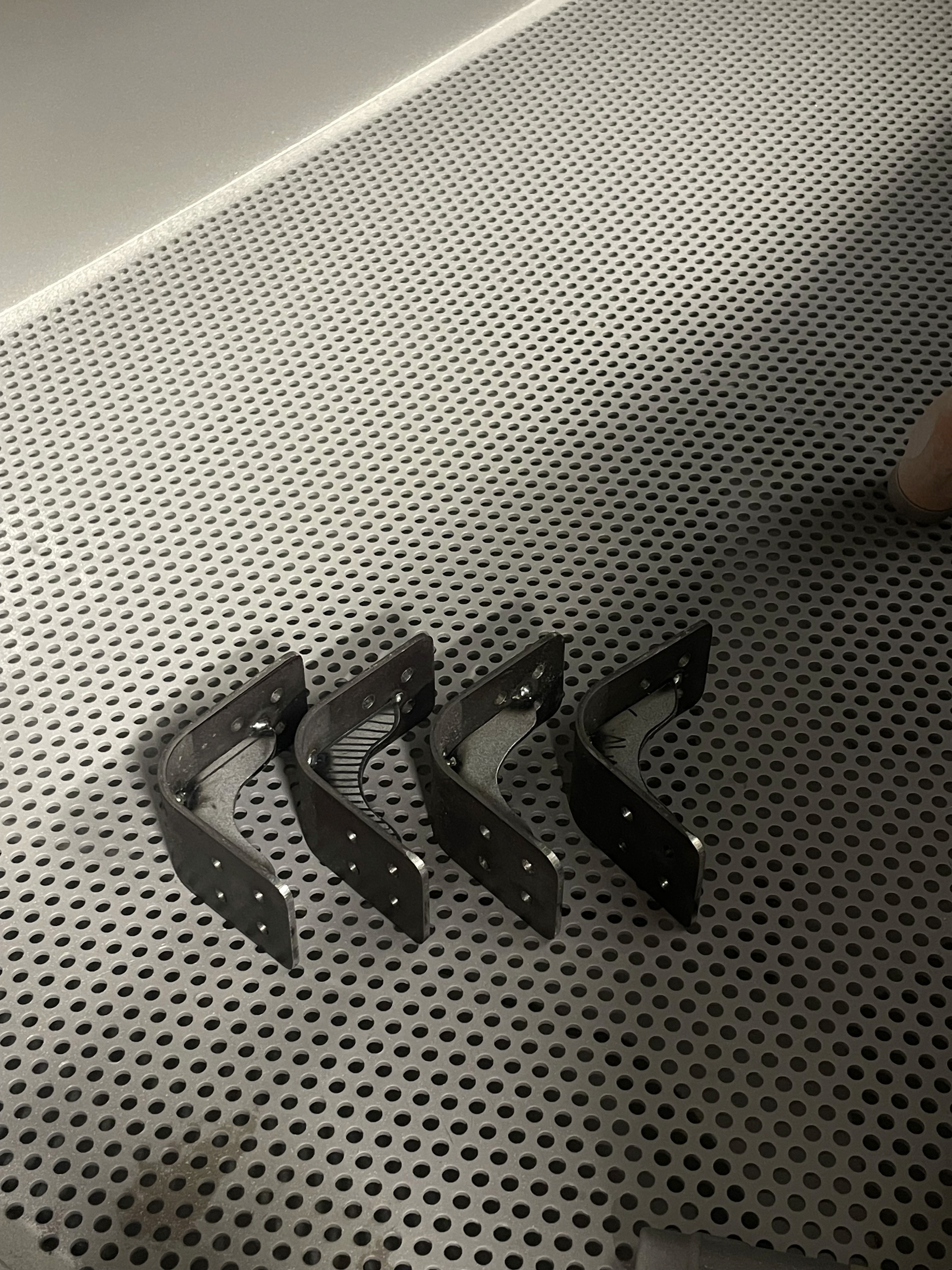 The brackets are the defining feature of Furuben. Each bracket is bent to a 90° angle, and an additional support rib is welded in place to increase structural rigidity.